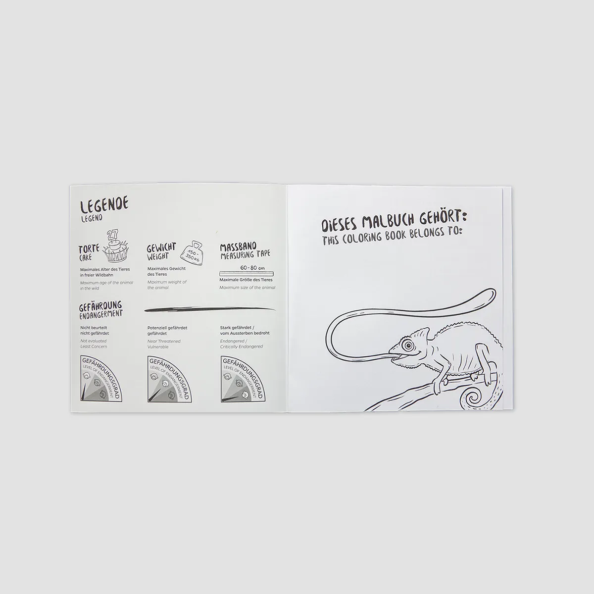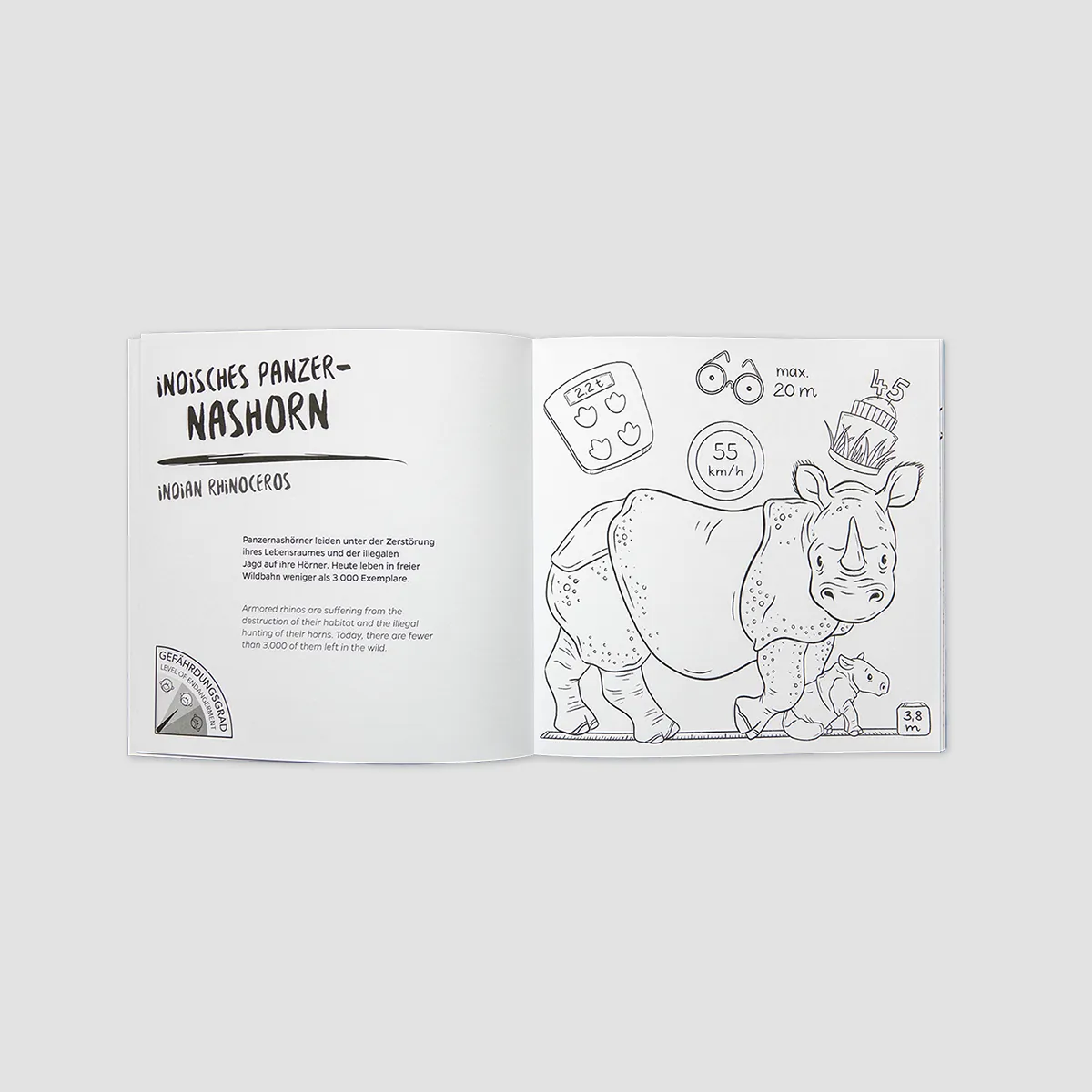 Dieses edukative Zoo-Malbuch vereint Wissen und Kreativität. Auf 60 Seiten gibt es jede Menge auszumalen und zu lernen. Denn neben den tierischen Motiven zum Ausmalen bietet dieses Malbuch zu jedem Tier Informationen wie Alter, Gewicht und Größe (in kindgerechten und selbsterklärenden Sketchnotes) und Interessante Fakten (in Textform). Der Gefährdungsgrad des Tieres laut IUCN ist in Form einer Skala zu sehen – zum Ausmalen und kindgerecht aufbereitet.